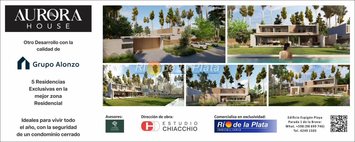 5 casas en condominio cerrado, terrenos de 800 y 950m2 con 300m2 edificados en dos niveles, 3 dormitorios en suite, toilette, living comedor, cocina americana, lavadero, galerías exteriores con parrillero y cochera.